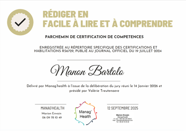 Cette certification atteste de mes compétences pour rendre l’information claire, accessible et compréhensible par toutes et tous.