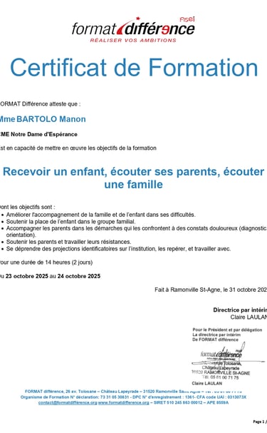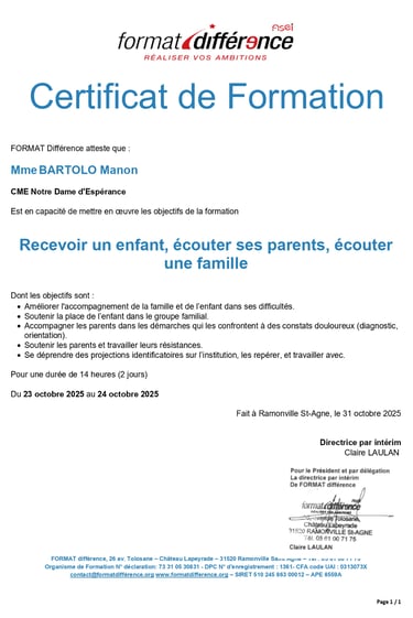 En octobre 2025, j'ai suivi la formation « Recevoir un enfant, écouter ses parents, écouter une famille » organisée par FORMAT Différence à Ramonville-Saint-Agne.