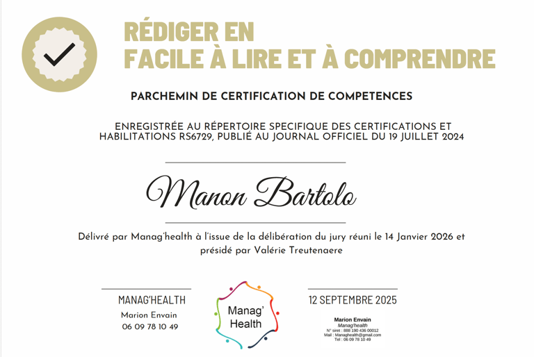 Je suis heureuse d’annoncer l’obtention de ma certification « Rédiger en Facile à lire et à comprendre (FALC) », enregistrée au Répertoire spécifique des certifications (RS6729).